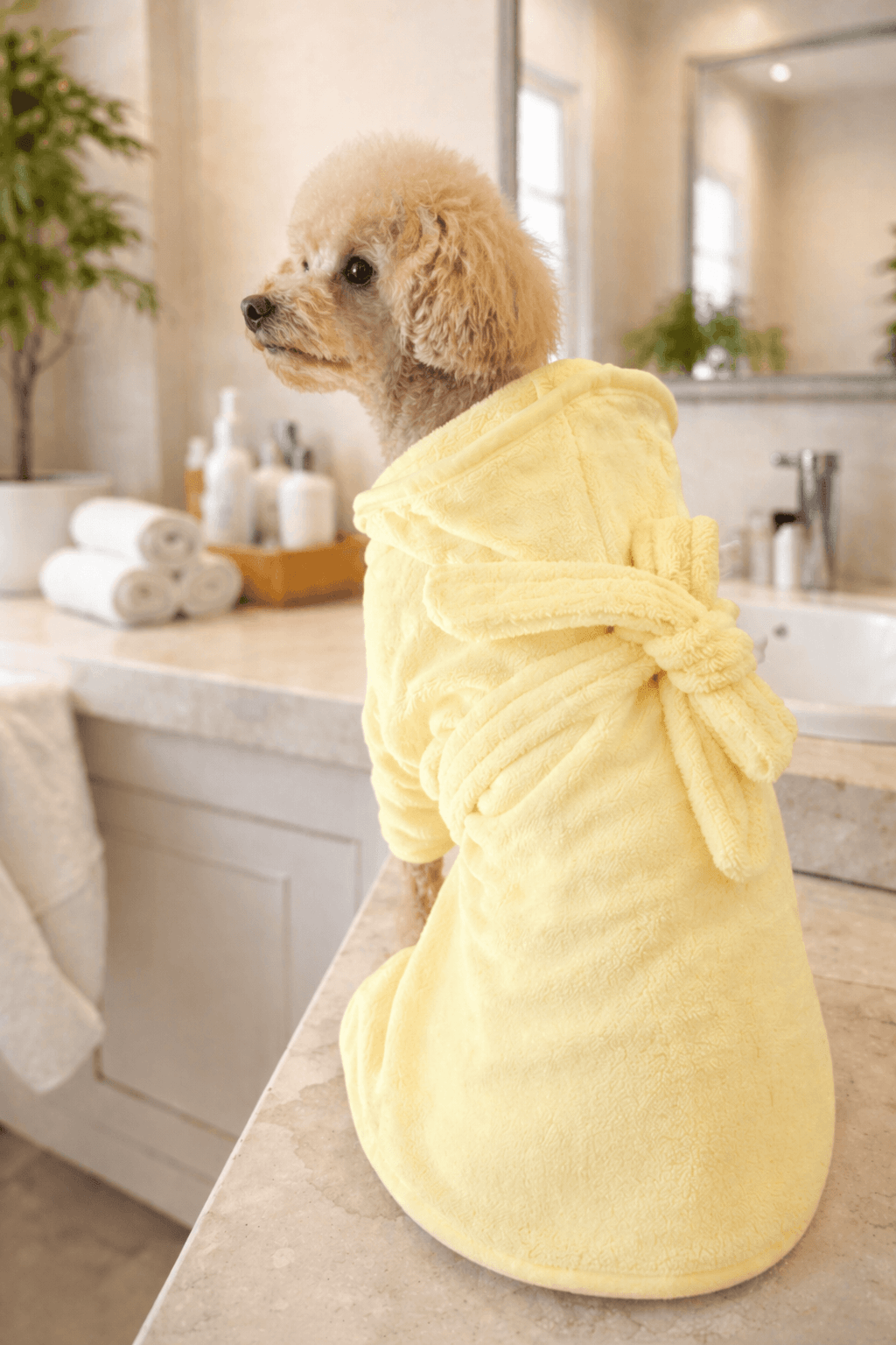 El albornoz para perros Sand de LOLO’S está confeccionado en tejido de rizo suave y altamente absorbente. Su amarillo vainilla cálido y apagado es uno de esos tonos que transmiten calma — una pieza pensada para el momento del baño o el regreso de un paseo en días de lluvia.